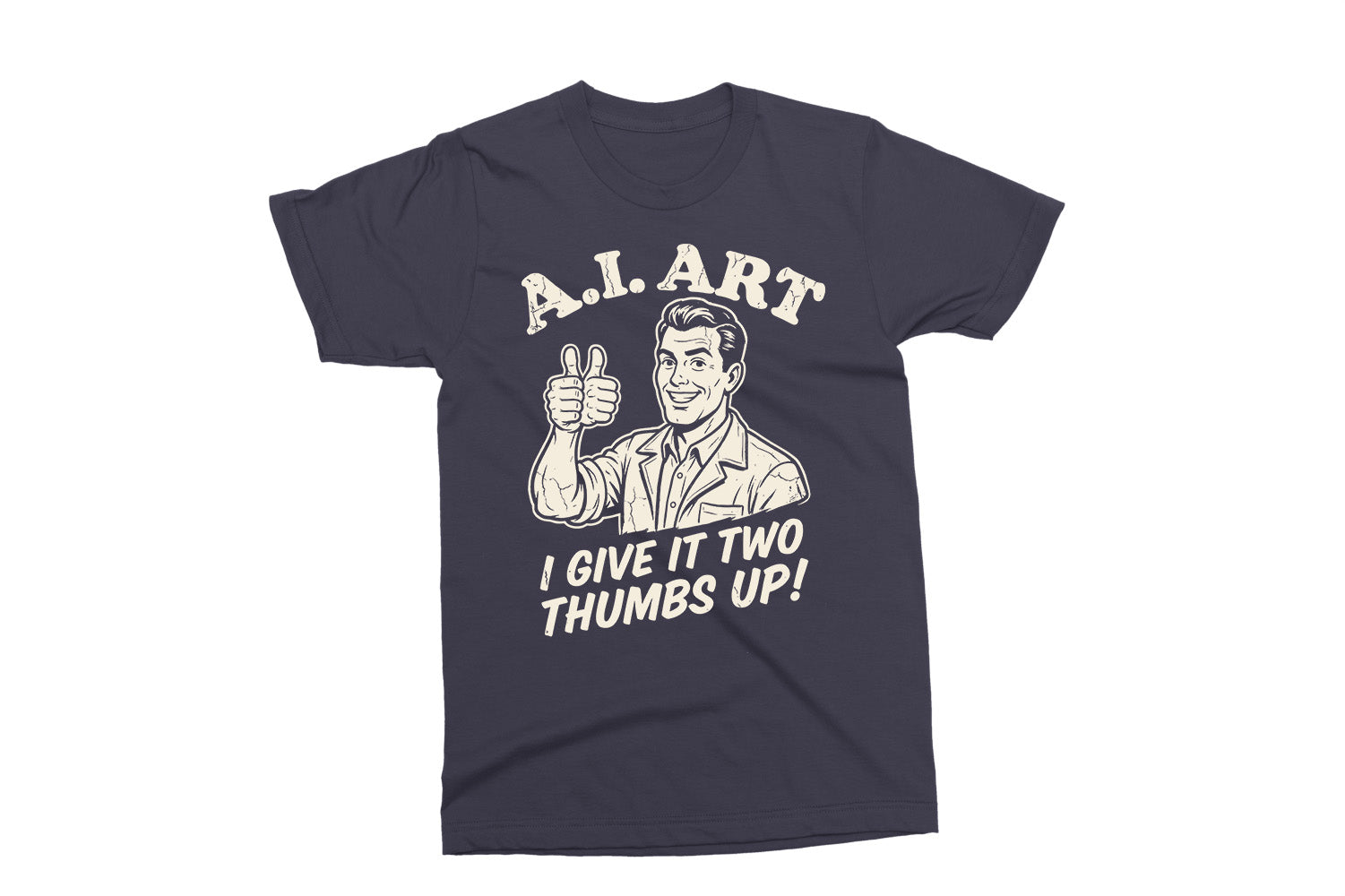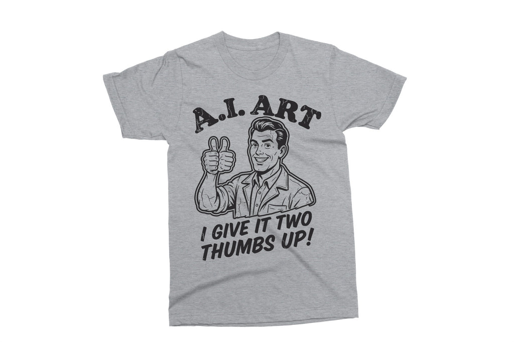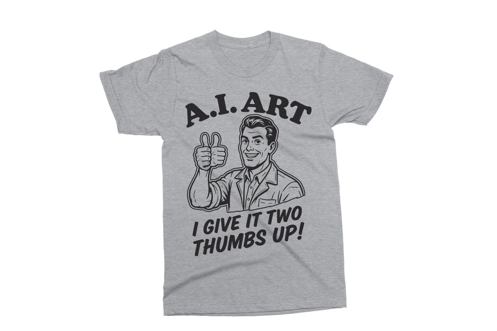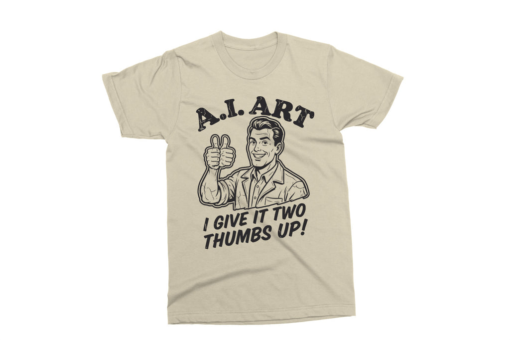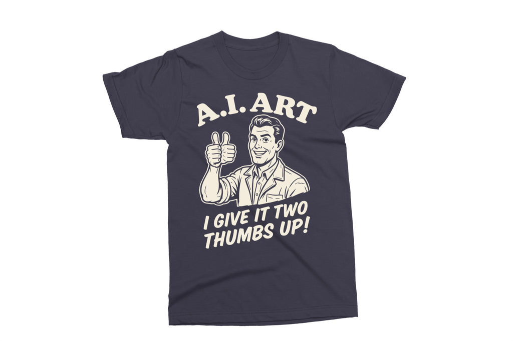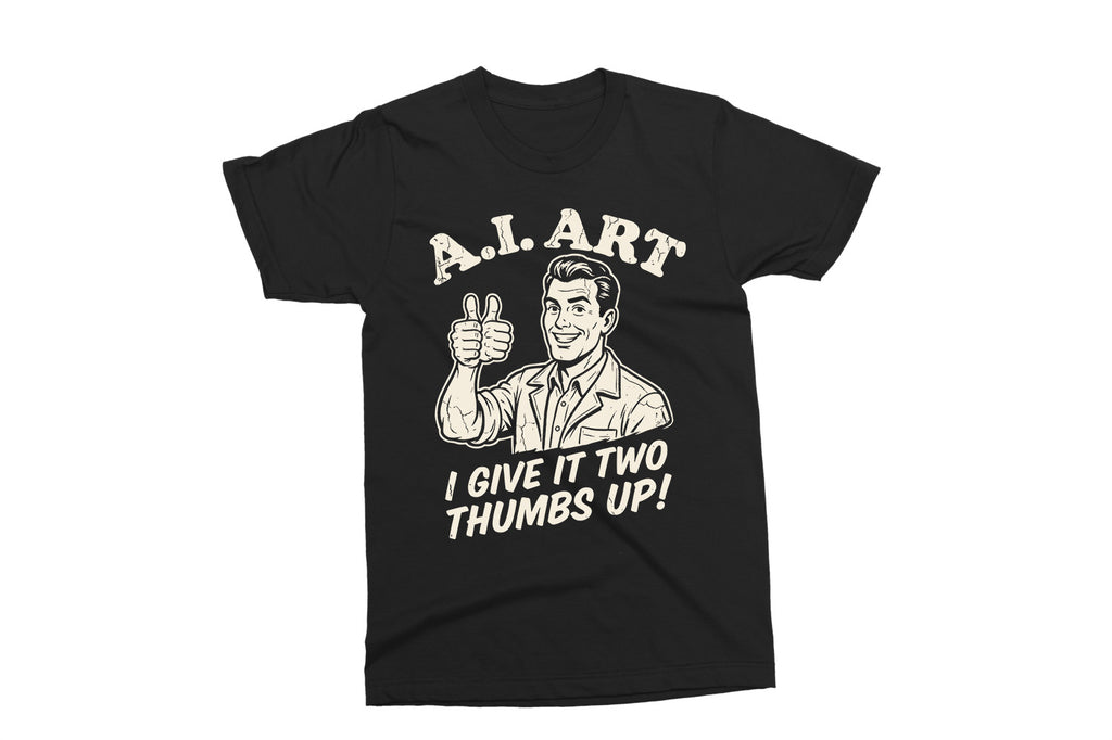 This “A.I. Art – I Give It Two Thumbs Up!” design is a fun, sarcastic take on modern tech and creativity. Perfect for designers, artists, tech lovers, or anyone who enjoys a clever retro-style joke.
