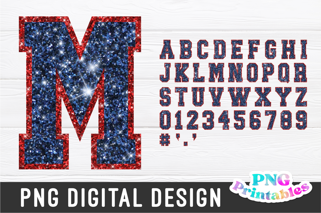 Navy Blue and Red glitter sport alphabet. including numbers, printable png file