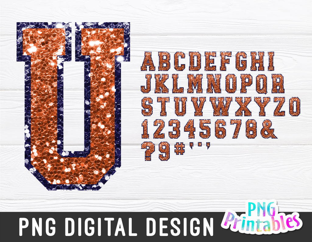 Orange and Navy sequin sport alphabet. including numbers, printable png file