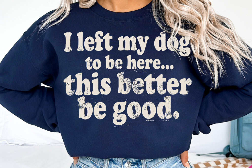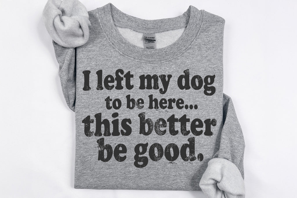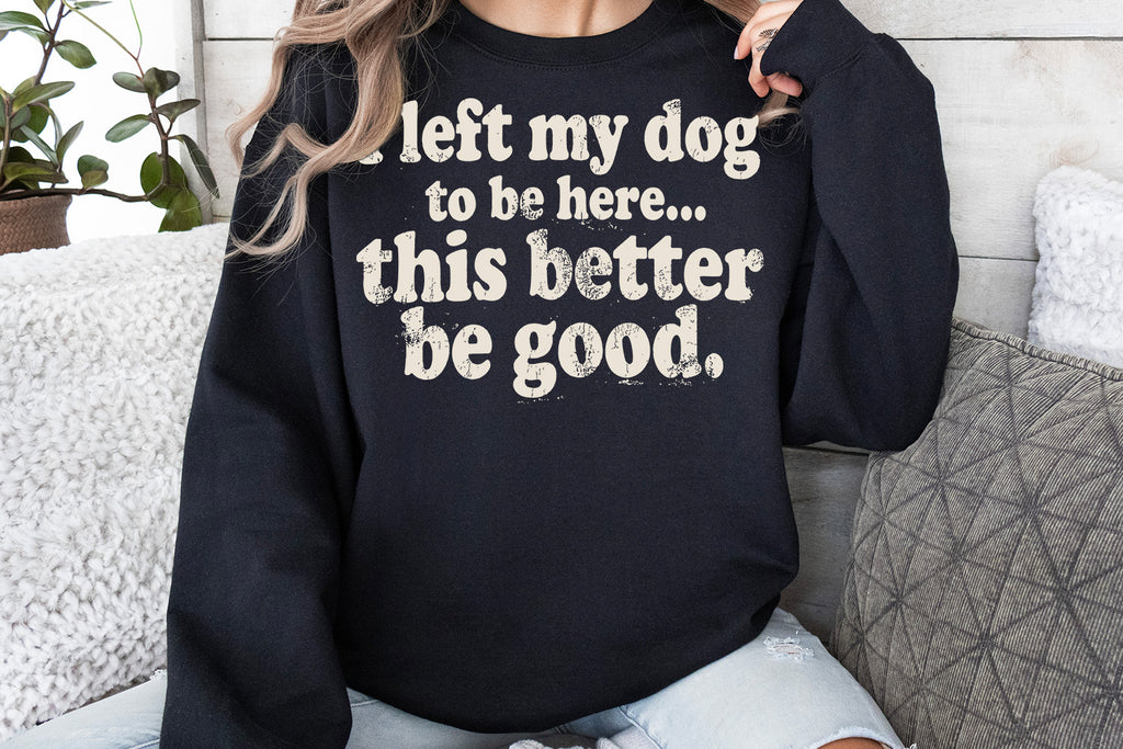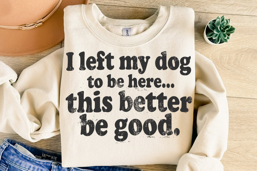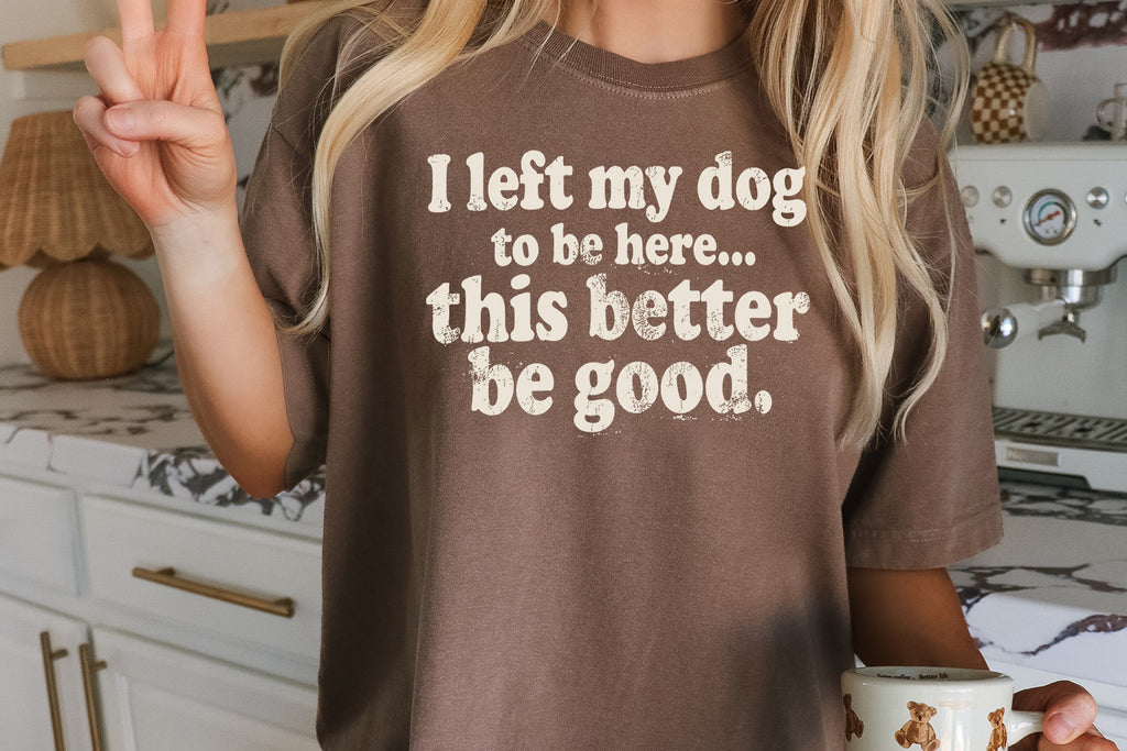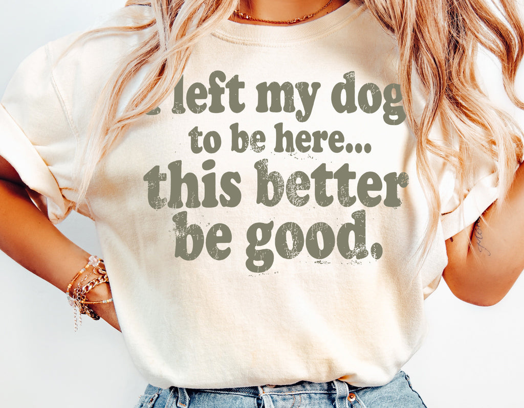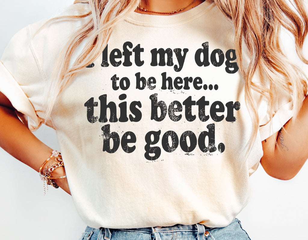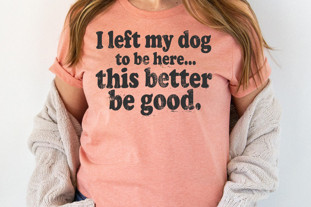 Funny dog lover t-shirt design that says “I left my dog to be here… this better be good.”
