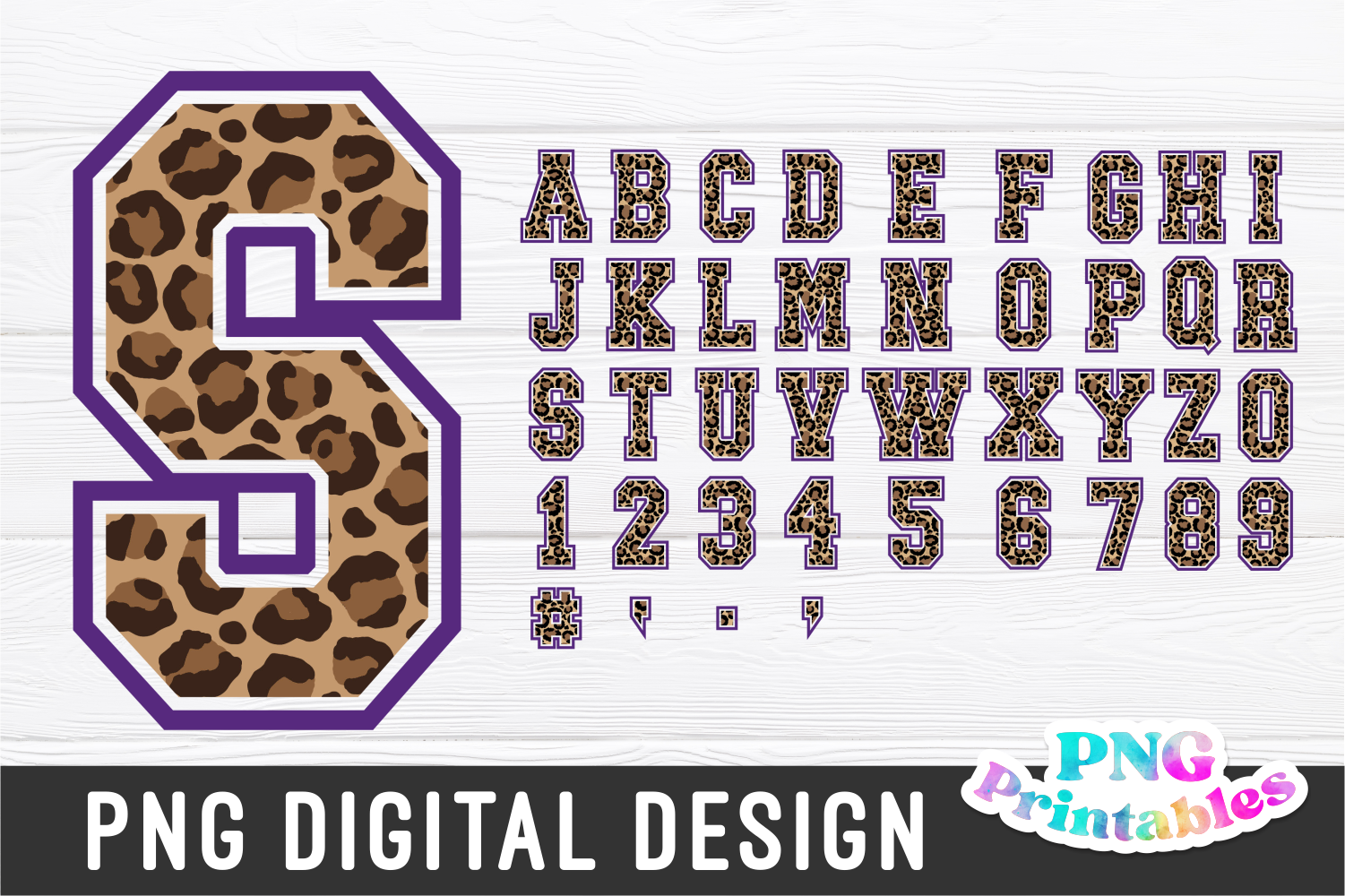 Leopard print with purple outlined alphabet. including numbers, printable png file